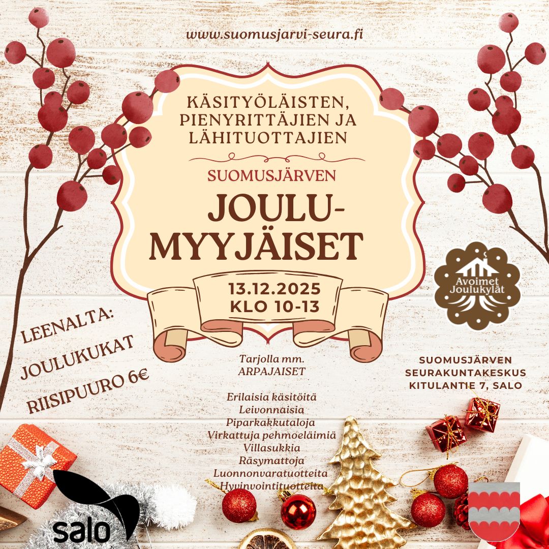 Suomusjärvi-Seuran joulumyyjäiset järjestetään lauantaina 13.12. klo 10–13 Suomusjärven seurakuntakeskuksessa osoitteessa Kitulantie 7, Salo.